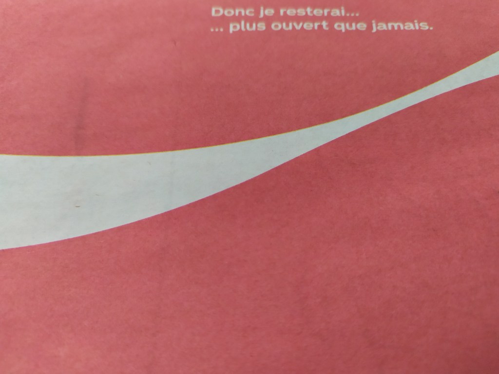 Un fond rouge, une ondulatioin. La marque en tout petit, presque illisible. Et le fabuleux slogan » pour votre santé, pratiquez une activité physique régulière ». Un programme national nutrition santé qui fricote avec du gazeux sombre d’outre-Atlantique. Pour quel profit ?!